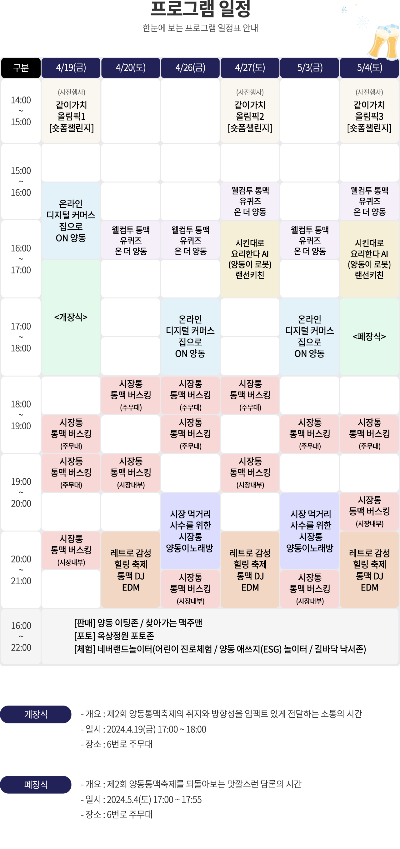 양동통맥축제는웰컴투 통맥 유퀴즈, AI 랜선키친, 시장통 통맥 버스킹 그리고 시장 먹거리 등 매주 다양한 행사와 함께 진행됩니다. 자세한 일정 안내는 아래 일정표를 참고하시기 바랍니다.