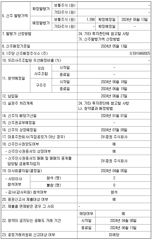 신주발행가액 (예정가) | 1,398원 (2024년 6월 13일 확정) |