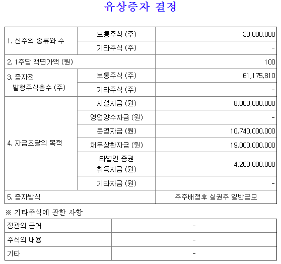 SG는 3천만 주의 신주를 발행하기로 결정했습니다. 이는 약 420억 원 규모의 유상증자로, 자금 조달의 목적은 다음과 같습니다.