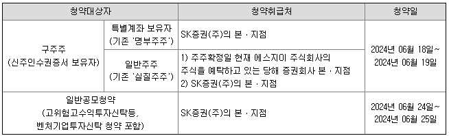 SG 청약 대표주관회사는 SK증권(주) 입니다. 우리사주, 구주주 및 일반주주 청약 모두 SG에서 청약 가능합니다. 자세한 청약 절차 및 청약 관련 사항은 [SK증권 공식홈페이지]에서 확인하시기 바랍니다.